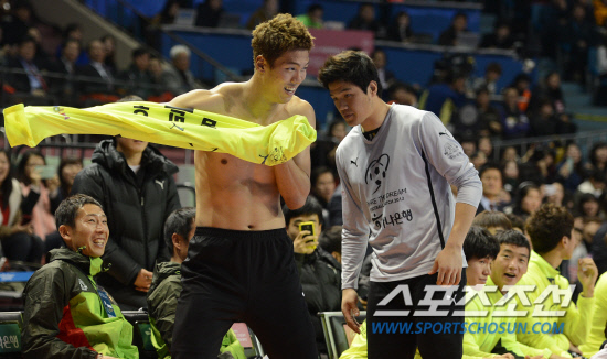 16일 오후 서울 잠실실내체육관에서 홍명보 자선경기 '하나은행과 함께하는 셰어 더 드림 풋볼 매치 2012'가 열렸다. 올해로 10년 째를 맞이하는 홍명보 자선경기 수익금은 소아암 어린이들과 소년소녀가장들을 돕는데 사용된다. 이범영이 유니폼을 갈아입으며 근육을 자랑하고 있다. 잠실=전준엽 기자 noodle@sportschosun.com