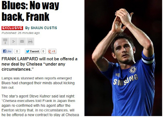 7일(한국시각) 복수의 영국 언론은 램파드의 에이전트 스티브 쿠트너의 말을 인용해 램파드가 첼시의 결정을 받아들여 팀을 떠날 것이라고 했다. 첼시는 세대교체를 위해 '레전드' 램파드에 재계약 제안을 하지 않았다. 램파드는 193골로 팀역사상 최다득점자에 이름을 올린 살아있는 전설이다. 램파드의 계약은 6월 끝이난다. 팬들은 불만을 품었지만, 첼시측은 흔들리지 않았다. 램파드도 결국 이를 받아들였다.