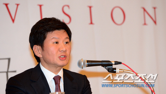 그러나 정 총재는 '현대가 세습 논란'에 대해서는 부적절하다고 했다. 그는 "축구인을 대표하는 16개 시도협회장과 8개 산하 연맹 회장 등 대의원의 투표를 통해 회장을 선출한다. 세습과 승계라는 말은 부적절한 표현"이라고 반박했다. '정 회장에게 조언을 구했느냐'는 질문에는 "정 의원(회장)님은 과거 16년 동안 축구협회를 이끌면서 월드컵 유치 등 엄청난 업적을 이룩했다. 기회가 있으면 경험을 많이 얻고자 한다. 하지만 정 의원님에 이어 조중연 회장이 협회장을 하면서 축구계가 분열, 소통이 안됐다는 비판도 듣고 있다. 이 부분이 내가 해결해야 할 부분"이라고 덧붙였다.