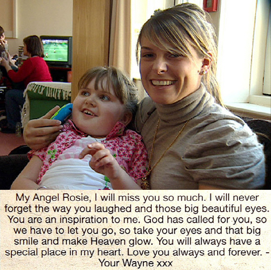 "나의 천사 로지, 언제나 너를 그리워할 거야. 웃는 모습, 커다란 두 눈도 잊지 않을게. 넌 나를 항상 고무시켜왔어. 신이 너를 불렀고 우린 널 놓아주어야 해. 자, 이제 눈을 뜨고 큰 웃음으로 천국을 빛내다오. 넌 항상 내 마음 속에 특별한 자리를 차지할 거야. 항상 그리고 영원히 사랑해. 너의 웨인."