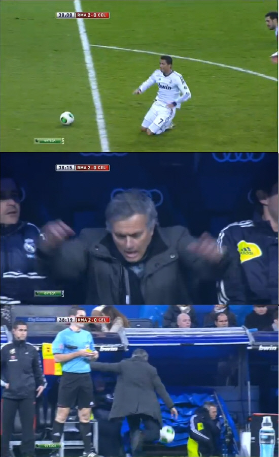 하지만 무리뉴 감독은 '골 기회를 빼앗았으니 퇴장을 시켜야 한다'고 생각했다. 화를 참지 못한 그는 벤치를 박차고 일어나더니 근처의 공을 주워 관중석 쪽으로 강슛을 날렸다. 격한 포즈에 바로 앞 경기진행요원이 고개를 돌리며 기겁하는 장면이 이채롭다.
