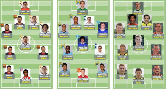 공격수로 팔카오와 함께 발롱도르의 주인공 리오넬 메시(FC바르셀로나)와 크리스티아누 호날두(레알 마드리드)가, 미드필더로 안드레스 이니에스타와 사비 에르난데스(이상 FC바르셀로나), 사비 알론소(레알 마드리드)가, 수비수로 다니엘 알베스와 헤라르드 피케(이상 FC바르셀로나) 마르셀루와 세르히오 라모스, 골키퍼 이케르 카시야스(이상 레알 마드리드)가 선정됐다.