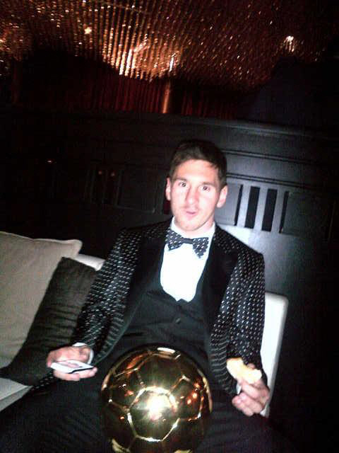 8일 발롱도르 시상식 뒤풀이에서 트로피와 함께 포즈를 취한 메시. 그는 바로 이 사진을 자신의 페이스북에 올렸다.