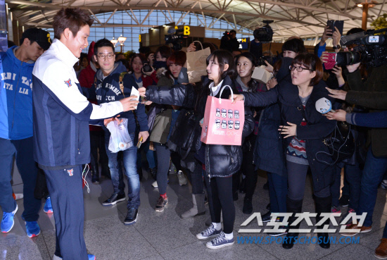 14일 오후 박태환이 인천국제공항을 통해 2013년도 첫 전지훈련지인 호주로 출국했다. SK와 결별 후 후원사를 물색하고 있는 박태환은 2014년 아시안게임 출전을 공식 선언한 후 호주 브리즈번에서 동계 전지훈련을 하며 몸상태를 최상으로 만들 계획이다. 출국에 앞서 박태환이 팬들에게 선물을 받아들고 있다. 인천공항=김경민 기자 kyungmin@sportschosun.com / 2013.01.14.
