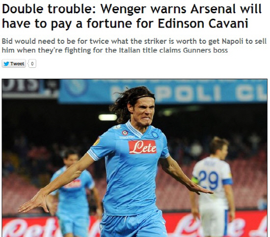 아르센 벵거 아스널 감독이 1월이적시장에서 에딘손 카바니(나폴리) 영입을 포기하겠다고 했다. 벵거 감독은 카바니의 오랜 팬이다. 카바니는 엄청난 득점력으로 세리에A 뿐만 아니라 세계 최고의 공격수 중 한명으로 평가받고 있다. 그의 바이아웃은 4500만파운드에 이른다. 나폴리는 바이아웃 금액이 아니면 카바니를 놓아주지 않겠다는 뜻을 분명히 하고 있다.