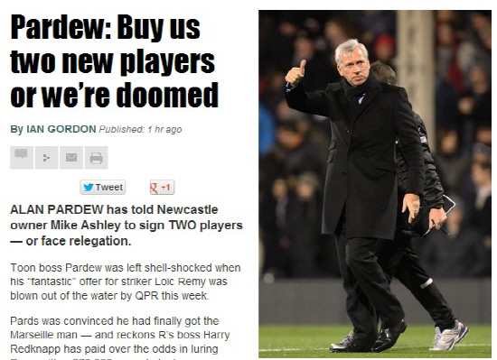알란 파듀 감독이 마이크 애슐리 구단주에게 경고했다. 미온적인 선수보강에 대한 실망의 표시다. 뉴캐슬은 1월이적시장에서 주포 뎀바 바를 첼시에 팔았다. 여기까지는 괜찮다. 대체자로 점찍었던 로익 레미를 퀸즈파크레인저스에 빼앗겼다. 시간이 얼마남지 않은 파듀 감독으로서는 분통이 터지는 결과다.