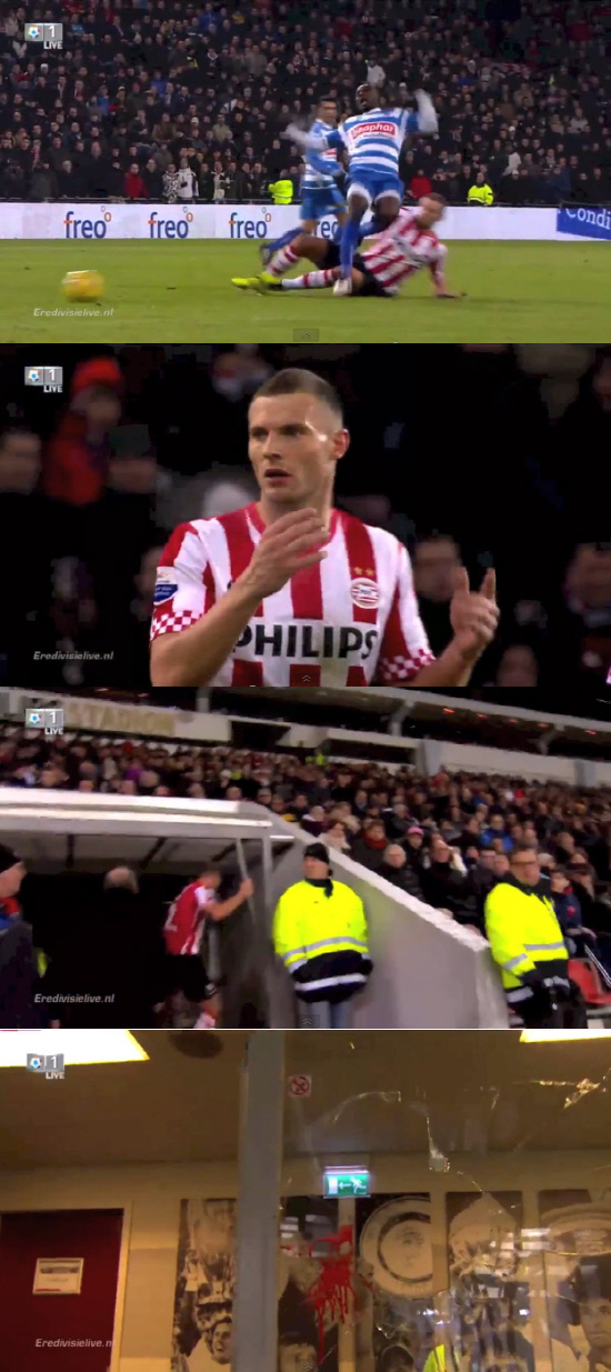네덜란드 국가대표팀 수비수 에릭 피터스(24, PSV 에인트호벤)가 레드카드를 받은 뒤 유리창에 화풀이를 해 손을 크게 다치는 사고가 일어났다.