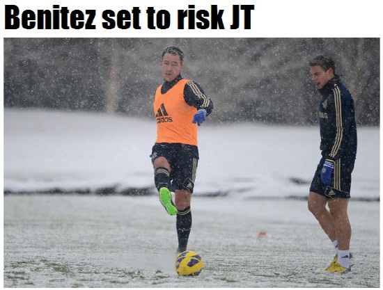 19일(이하 한국시각) 영국 일간지 더선은 베니테스 감독이 20일 아스널전에서 테리를 선발로 기용할 예정이라고 보도했다. 베니테스 감독은 "우리는 테리와 열심히 훈련 중이다. 강인한 캐릭터를 지닌 선수와 그라운드에서 함께 하는 것은 중요한 일이다"고 했다. 이어 "우리는 경험많은 선수들이 있지만, 리더를 의미하는 것은 아니다. 테리와 같은 정신력을 가진 선수가 필요하다"며 출전을 예고했다.