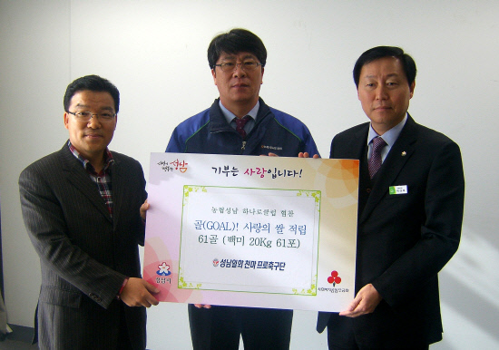 성남 일화(단장 박규남)가 18일 성남시청 사회복지과에서 농협하나로클럽과 함께하는 '사랑의 골 릴레이 쌀 나누米' 기부행사 전달식을 진행했다.