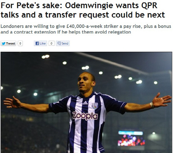 피터 오뎀윙기(웨스트브로미치)가 퀸즈파크레인저스(QPR)로 이적에 강한 의지를 보이고 있다.