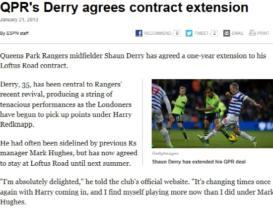 QPR은 22일(한국시각) 홈페이지를 통해 '지난 2010년 6월 QPR에 합류한 숀 데리와 2014년 여름까지 재계약했다. 팀에서 91경기를 뛰면서 많은 역할을 해낸 데리가 앞으로 더 큰 활약을 펼칠 것으로 기대한다'고 발표했다.