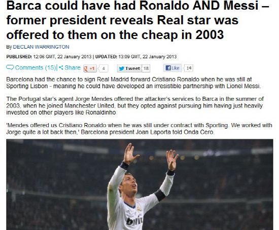 실제로 그럴 기회가 있었다. 후안 라포르타 전 바르셀로나 회장은 스페인 라디오 방송 온다 세로와의 인터뷰에서 "호날두의 에이전트가 우리에게 직접 호날두 영입을 제안했다. 실제로 꽤 진척됐었다"고 했다. 이어 "우리는 맨유가 호날두를 영입했던 금액보다 싸게 호날두를 데려올 수 있었다. 그러나 우리는 호나우딩요, 히카르두 콰레스마, 라파엘 마르케스를 영입하느라 다른 영입을 하기에는 재정적으로 부족했다"고 영입실패의 뒷이야기를 털어놨다. 만약 이때 바르셀로나가 호날두를 영입했다면 메시와 함께 상대 골문을 공략하는 모습을 볼 수 있었을지도 모른다.