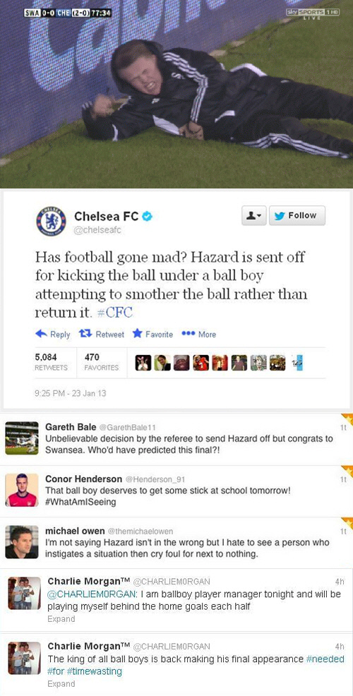 우선 첼시가 볼보이의 행위를 강력 비난했다. 첼시는 공식트위터의 경기 문자 중계를 "축구가 미쳐 돌아가고 있나? 공을 돌려주지 않고 배로 덮어버린 볼보이를 가격했다는 이유로 아자르가 퇴장당했다"고 노골적인 멘션을 날렸다.