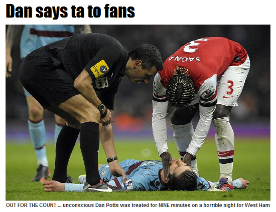 포츠는 24일(한국시각) 에미레이츠 스타디움에서 열린 아스널과의 잉글랜드 프리미어리그(EPL) 경기 도중 바카리 사냐와 공중볼 경합을 벌이다가 그라운드에 쓰러졌다. 포츠는 의식이 없었다. 심장마비를 의심한 의료진이 그라운드에 들어와 긴급하게 응급조치를 했고 산소마스크를 쓴 채 들것에 실려 병원으로 이송됐다. 포츠의 동료인 웨스트햄과 아스널 선수들도 모두 그의 곁에서 상태를 지켜보며 쾌유를 빌어줬다.
