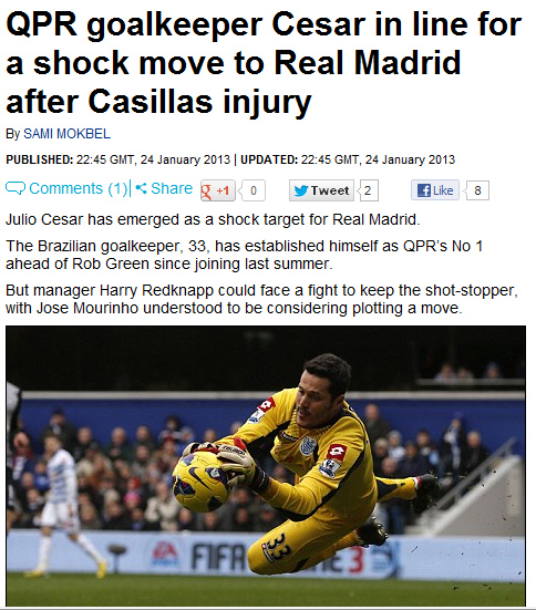 스페인 프리메라리가 레알 마드리드가 잉글랜드 프리미어리그(EPL) 퀸즈파크 레인저스(QPR)의 골키퍼 훌리오 세자르 영입을 고려중이다.