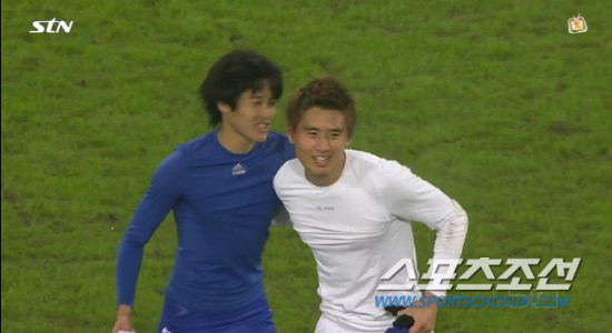 ◇구자철과 우치다가 한치 양보없는 경기 직후 유니폼을 교환하며 환하게 웃고 있다. 화면캡처=StN