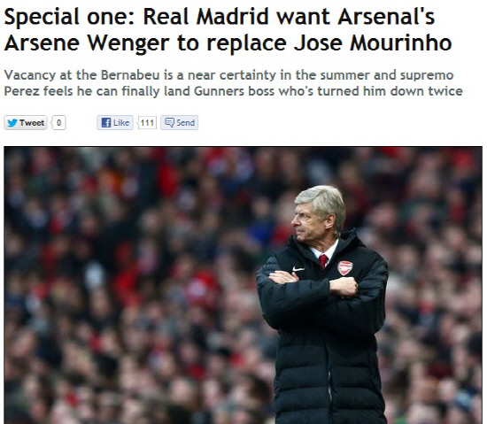 27일(한국시각) 영국 주간지 더피플은 플로렌티노 페레스 레알 마드리드 회장이 올여름 조제 무리뉴 감독을 대체하기 위해 벵거 감독의 영입을 노리고 있다고 보도했다. 벵거 감독이 레알 마드리드의 러브콜을 받은 것은 이번이 처음이 아니다. 벵거 감독은 이미 두차례나 레알 마드리드의 제안을 거절한 바 있다. 레알 마드리드는 이번이 벵거 감독을 영입할 수 있는 적기라 여기고 있다. 벵거 감독은 2014년까지 계약이 돼 있지만, 최근들어 계속된 스타선수들의 이탈과 성적부진으로 팬들의 지지를 잃고 있다.