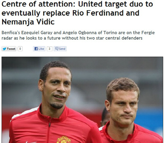 27일(한국시각) 영국 주간지 더선데이피플은 알렉스 퍼거슨 감독이 리오 퍼디낸드와 네마냐 비디치를 대체할 새로운 선수들을 노리고 있다고 보도했다. 주인공은 벤피카의 에제키엘 가라이와 토리노의 안젤로 오그보나다.