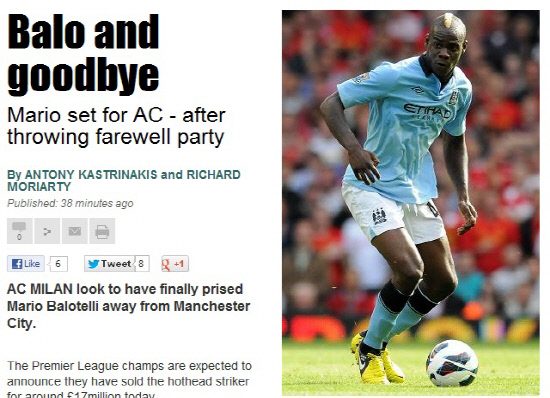 28일(한국시각) 영국 일간지 더선은 AC밀란이 28일 중으로 이적료 1700만파운드에 발로텔리 영입을 확정할 것이라고 보도했다. 더선에 따르면 AC밀란이 이적료를 줄이기 위해 케빈 프린스 보아텡을 포함한 딜이 될 가능성이 높다고 했다. 맨시티는 당초 발로텔리의 몸값으로 3100만파운드를 고수한 바 있다. 1700만파운드+보아텡이면 맨시티가 원하는 금액과 비슷해진다.