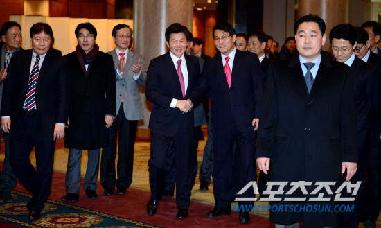 정몽규 회장이 제52대 대한축구협회장에 당선 됐다. 28일 서울 서대문구 홍은동 그랜드힐튼호텔에서 열린 2013년 대한축구협회 정기 대의원총회에서 정몽규 회장이 2차 투표까지 가는 접전 속에 15표를 획득하며 9표에 그친 허승표 대표에게 승리하며 축구협회장에 당선 됐다. 당선이 확정된 후 윤상현 의원의 축하를 받고 있는 정 회장. 홍은동=송정헌 기자 songs@sportschosun.com/2013.1.28