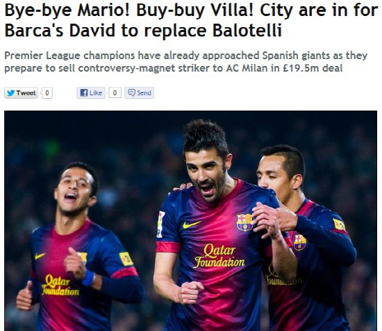 맨시티는 즉각 선수영입에 나섰다. 30일 영국 일간지 데일리미러는 맨시티가 바르셀로나에서 주전경쟁으로 힘겨워하는 비야에 러브콜을 보내고 있다고 했다. 로베르토 만시니 감독은 공격진에 4명의 스트라이커를 보유하길 원한다. 발로텔리의 공백을 이적시장이 닫히기 전 빨리 메우고 싶어하는 것으로 알려졌다. 맨시티는 발로텔리 방출 전에도 한차례 접촉한 바 있는 비야에게 눈길을 돌렸다. 바르셀로나는 비야의 방출을 원치 않지만 1500만파운드의 몸값이면 마음을 돌릴 수 있을 것이라고 데일리미러는 전망했다. 비야는 부상 복귀 후 스피드면에서 다소 하락한 모습을 보이고 있지만, 충분한 출전기회만 주어지면 두자릿수 골을 보장할 수 있는 공격수다.