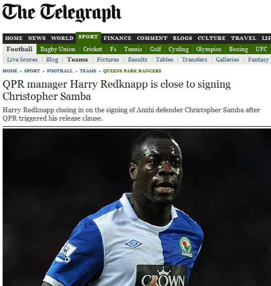 31일(한국시각) 영국 일간지 텔레그라프은 '레드냅 감독이 러시아 안지의 수비수 크리스토퍼 삼바의 영입에 가까워졌다'고 보도했다.