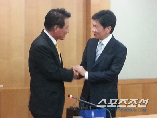 훈훈한 장면이 연출됐다. 예기치 않은 깜짝 만남이 이뤄졌다. 정몽규 회장이 출현했다. 둘은 뜨겁게 악수를 했다. 허 회장은 "이런 곳까지 왜 오셨느냐"며 감사해 했고, 정 회장은 "당연이 와야죠. 많은 조언을 부탁드립니다"라며 미소를 지었다.