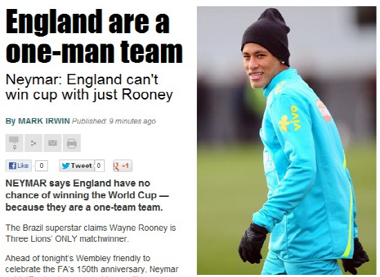 '차세대 슈퍼스타' 네이마르(브라질)가 잉글랜드에 쓴 소리를 던졌다. 네이마르는 7일(한국시각) 영국 런던 웸블리에서 열릴 잉글랜드와의 영국축구협회(FA) 창립 150주년 기념 경기에 앞서 "잉글랜드는 좋은 선수들을 보유한 좋은 팀이다. 그러나 월드컵에서 브라질의 라이벌로 생각하지는 않는다"며 "루니를 빼놓고는 경기를 승리로 이끌 수 있는 선수가 보이지 않는다"고 했다. 이어 "잉글랜드가 스페인이나 아르헨티나만큼의 퀄리티를 가졌다고 생각하나? 나는 아니라고 생각한다"며 "아르헨티나는 메시가 부진해도 아게로나 테베스가 있고, 스페인도 이니에스타가 뛸 수 없어도 사비와 비야가 있다"고 했다. 잉글랜드로서는 기분 나쁠 얘기다.