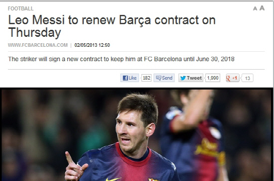 현재 메시와 바르셀로나의 계약 기간은 2016년까지다. 재계약을 하면 기존 계약에서 2년을 연장하게 된다. 바르셀로나는 지난해 12월 메시와의 계약을 2018년까지 연장할 예정이라고 이미 발표했다.