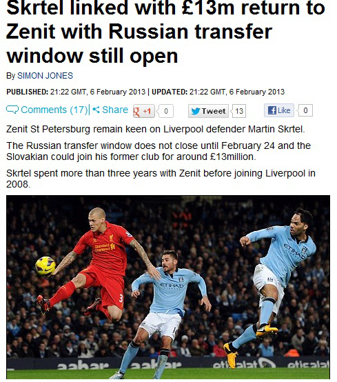 7일(한국시각) 영국 일간지 데일리메일은 러시아의 거부 제니트가 리버풀의 수비수 스크르텔 영입을 노리고 있다고 보도했다. 제니트는 스크르텔의 친정팀이다. 스크르텔은 제니트에서 3년을 보낸 뒤 2008년 리버풀로 이적했다. 스크르텔은 강인한 파워를 앞세워 이적하자마자 리버풀의 주전자리를 꿰찼다.