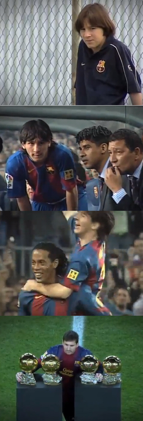 영상은 14~15세 무렵 앳된 얼굴로 유소년 아카데미 '라 마시아'에서 뛰는 장면으로 시작한다.