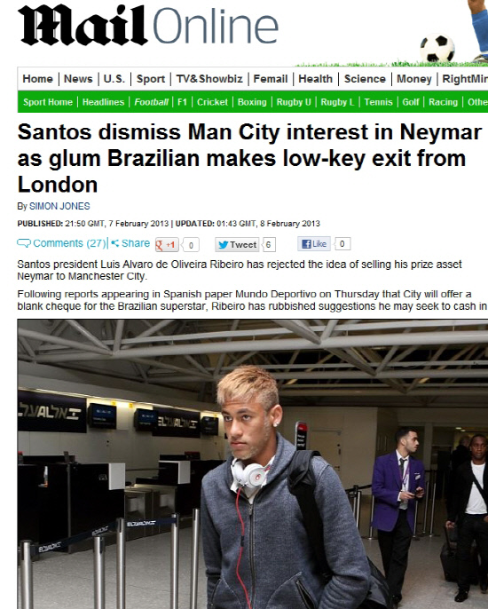 데니스 코치의 정보는 정확했다. 8일(한국시각) 영국 일간지 데일리메일은 스페인 스포츠신문 문도 데포르티보의 보도를 인용, 올리베이라 산토스 사장이 잉글랜드 맨시티의 강력한 러브콜을 거절했다고 전했다. 맨시티는 백지수표를 네이마르 측에 내밀 예정이다. 그래도 올리베이라 사장은 끄떡 않을 전망이다. 현금이 아니면 제안은 무의미하다고 했다. 올리베이라 사장은 "네이마르에 대한 어떠한 제안이 오더라도 내 대답은 '거절'이다. 네이마르는 산토스에서 2014년까지 잔류할 것"이라고 말했다.