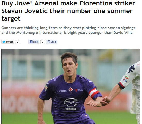 8일(한국시각) 영국 일간지 데일리미러는 벵거 감독이 올여름 이적시장에서 피오렌티나의 판타지스타 스테판 요베티치와 나폴리의 골머신 에딘손 카바니 영입을 노리고 있다고 보도했다. 겨울이적시장에서 다비드 비야 영입을 저울질했던 벵거 감독은 여름이적시장에서 이탈리아의 대어들을 영입하는 쪽으로 마음을 굳혔다.