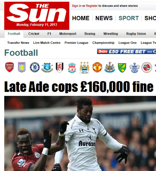 엠마누엘 아데바요르가 소속팀 토트넘에 16만파운드(약 2억7500만원)의 벌금을 낼 전망이다.