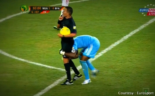 나이지리아 '괴짜 골키퍼' 빈센트 엔예마(31 마카비 텔아비브)의 코믹한 우승 세리머니가 화제다. 주심을 번쩍 들어올리려 했으나, 야속한 주심은 미동조차 하지 않았다.