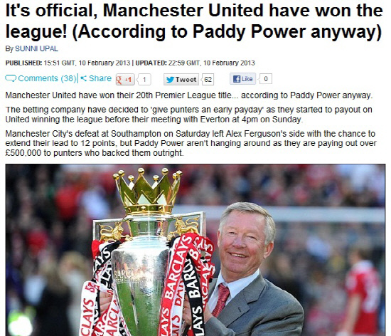 아직 시즌이 한참 남았다. 그러나 스포츠베팅업체 파디파워에 따르면 맨유가 20번째 잉글랜드 프리미어리그 우승을 확정지었다.