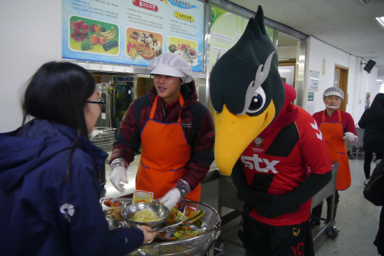 선수들은 1시간 동안 학생들을 위해 교내식당에서 앞치마를 두르고 위생모자와 위생장갑을 끼고 학생들에게 자장면 배식활동을 펼쳤다. 점심 시간 후에는 팬 사인회도 열었다. 밸런타인데이를 앞두고 손수 준비한 초콜릿을 학생들에게 선물, 두 배의 기쁨을 줬다.