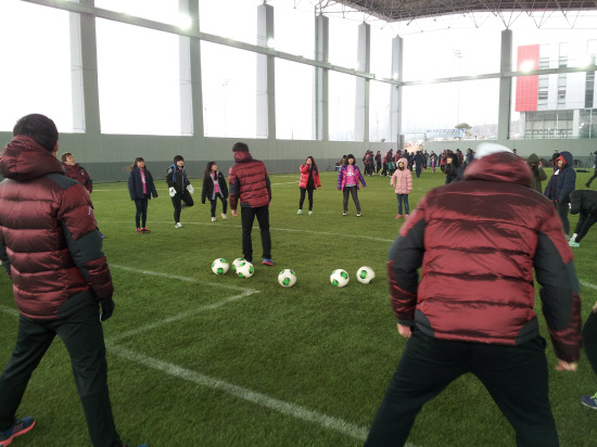 | ◇축구교실을 통해 재능기부를 펼치고 있는 경남 선수단. 사진제공=경남FC |