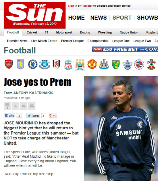 무리뉴 감독은 맨유와의 2012~2013시즌 유럽챔피언스리그 16강 1차전 기자회견에서 "레알 마드리드 이후 나는 잉글랜드에서 지도자 생활을 하길 원한다. 잉글랜드에 대한 모든 것이 아름답다. 내가 바라는 것들이 이뤄질 것"이라고 말했다. 그러면서 "정상적으로 밟게 될 수순"이라고 덧붙였다.
