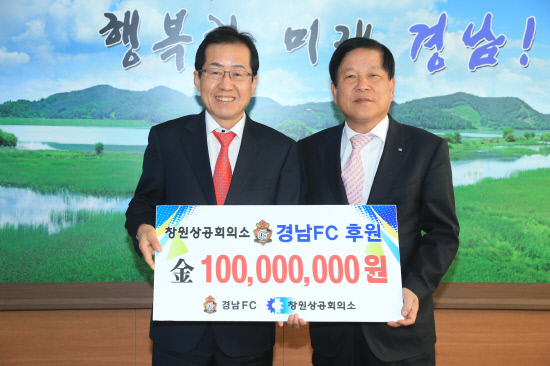 최충경 창원상공회의소 회장은 13일 경남도청을 방문, 구단주인 홍준표 도지사에게 경남FC 발전 후원금 1억원을 전달했다. 홍 구단주는 "요즘 경기가 안 좋아 어려우신데도 뜻을 모아 협조해 주셔셔 감사하다"며 "조선 경기가 회복되면 경남 기업의 경기도 전체적으로 조금 씩 살아날 것"이라고 말했다.