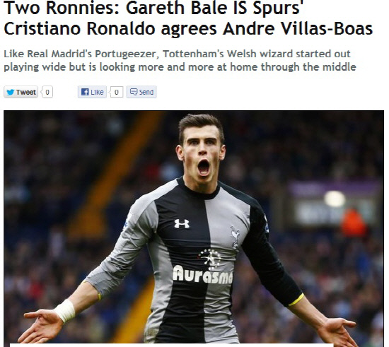 토트넘의 미드필더 가레스 베일(24)은 '제2의 호날두'로 불린다. 플레이 스타일도 비슷하다. 빠른 스피드와 저돌적인 돌파가 돋보인다. 공교롭게도 베일은 호날두의 열혈 팬이다. 그 동안 호날두가 자신의 롤모델이라고 줄기차게 언론에 밝혀왔다.