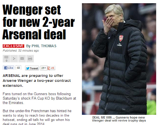 1996년 10월부터 아스널 지휘봉을 잡은 벵거 감독은 3차례 리그 우승과 4번의 FA컵 우승을 일궈냈다. 하지만 2005년 맨유를 꺾고 FA컵 우승을 차지한 뒤 현재까지 메이저 대회 우승과 연을 맺지 못하고 있다. 지난 주에는 챔피언십(2부리그) 소속 블랙번에 패하면서 FA컵 탈락의 수모를 맛보면서 팬들의 비난을 받고 있다.