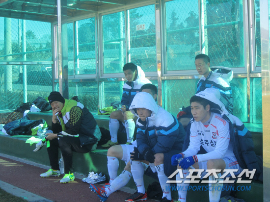 이근호 이 호 김동찬 김형일 등 상주 상무의 초호화멤버가 성남과의 연습경기 직후 벤치에서 박항서 감독의 이야기를 듣고 있다.