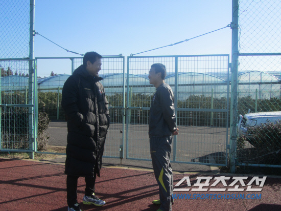 안익수 감독이 부산 아이파크 시절 제자인 상주상무 유지훈과 활짝 웃는 얼굴로 이야기를 나누고 있다.