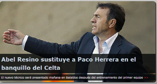 셀타비고는 19일(한국시각) 구단 홈페이지를 통해 '파코 에레라 감독을 대신해 레시노 감독이 1군팀을 맡게 됐다'고 발표했다. 스페인 현지 언론은 하루 전 셀타비고가 성적 부진을 이유로 에레라 감독을 경질했으며, 레시노 감독 영입을 준비하고 있다고 밝혔다. 셀타비고는 승점 20으로 전체 20개 팀 중 18위에 그치고 있어 한 시즌 만에 세군다리가(2부리그)로 돌아갈 위기에 처한게 사실이다. 셀타비고 구단 측은 '에레라 감독이 팀을 프리메라리가로 진출시킨 업적에 대해 감사함을 느끼고 있다'며 노고를 치하하며 작별인사를 했다.