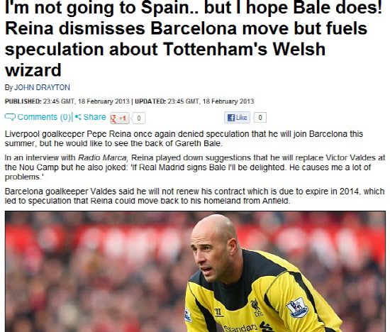 대신 레이나는 레알 마드리드와 연결된 가레스 베일의 스페인 이적설에 대해서는 적극 찬성했다. 레이나는 "만약 베일이 레알 마드리드로 간다면 행복할 것 같다. 그는 나에게 많은 문제를 안겼다"며 웃었다.
