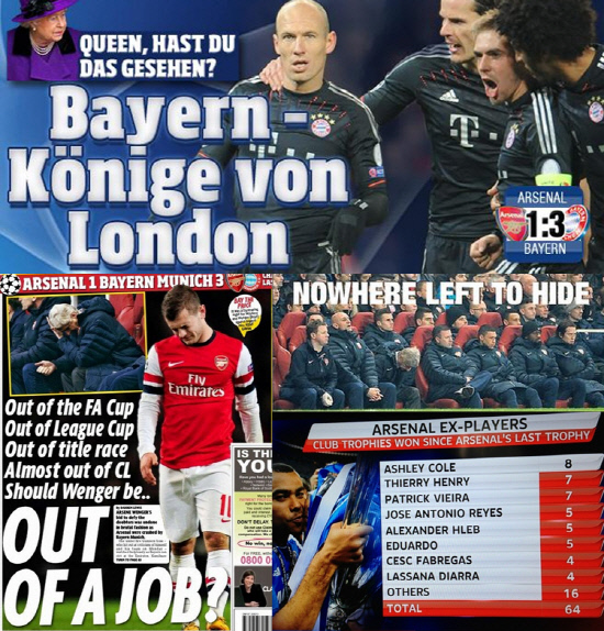 유럽 최대 부수를 자랑하는 독일의 대중지 '빌트'는 "오늘밤 바이에른이 런던의 여왕이 됐다"면서 엘리자베스 여왕의 사진을 노출한 뒤 "여왕님, 오늘 밤 경기 보셨나요?"라는 헤드라인을 뽑았다. 자국팀의 압도적인 실력과 아스널의 졸전을 비교하며 영국인의 자존심을 건드렸다.