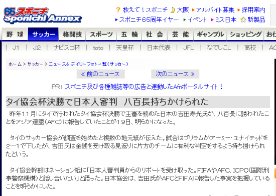 일본 스포츠지 스포츠닛폰은 20일 '지난해 11월 4일 태국서 열린 부리람 유나이티드-아미 유나이티드 간의 태국FA컵 경기 주심을 맡았던 요시다 도시미츠 심판(50)이 승부조작을 제의 받았던 사실을 아시아축구연맹(AFC)에 고발했다'고 전했다. 요시다 심판은 승부조작을 노린 조직이 자신들이 돈을 건 팀에게 유리한 판정을 내려달라고 제의했으나, 이를 거절했다는 것이다. AFC는 20일과 21일 말레이시아 콸라룸푸르의 AFC본부에서 열리는 회의를 통해 이 문제를 논의하기로 했다. 태국축구협회 역시 '일본 심판으로부터 보고서를 받았으며, AFC 뿐만 아니라 국제축구연맹(FIFA), 인터폴(ICPO)과 협조할 것'이라고 밝혔다.