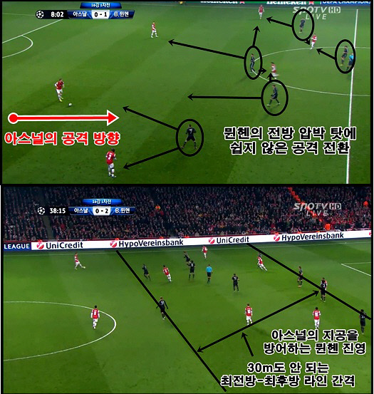 전반 초반 반짝했던 역습이 연이은 실점으로 사그라진 뒤, 아스널은 좀처럼 공격의 템포를 살려내질 못했다. 이들의 공격은 너무나도 촘촘했던 뮌헨의 라인 속에 갇혔고, 속공이 지공으로 변해버려 월콧의 스피드를 살리기도 어려웠다. 카솔라가 계속 위험 진영 바깥으로 밀려나 월콧과의 거리가 벌어지자 결정적인 패스가 제공될 확률도 확연히 줄어들었고, 포돌스키의 활약은 만회골 이후 흐름을 타던 짧은 순간에 그쳤다. 홀로 유유히 빛난 윌셔의 드리블 돌파를 받쳐줄 만한 자원이 없던 상황, 그렇다고 월콧이 상대 수비를 등지는 포스트 플레이를 해줄 수도 없는 노릇이었다. 1선에서의 분투가 승산이 없을 때 상대 뒷공간을 찌르는 롱패스를 노려봄 직도 했지만, 이마저도 재미를 보지는 못했다.?