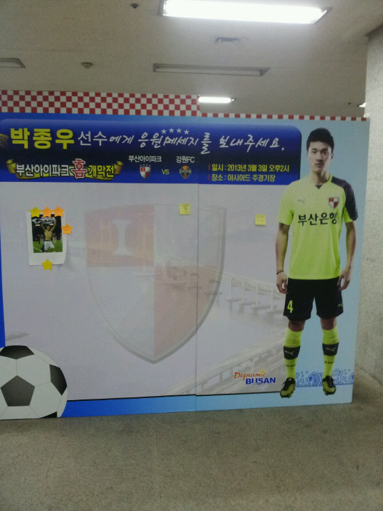 부산은 3일 부산월드컵경기장에서 벌어질 강원과의 K-리그 클래식 홈 개막전을 맞이해 부산 시민들과 함께 하는 이벤트를 진행한다. '독도 세리머니' 이후 많은 시련을 겪었던 박종우에게 시민들이 직접 따뜻한 한 마디를 전할 수 있는 기회를 제공한다.